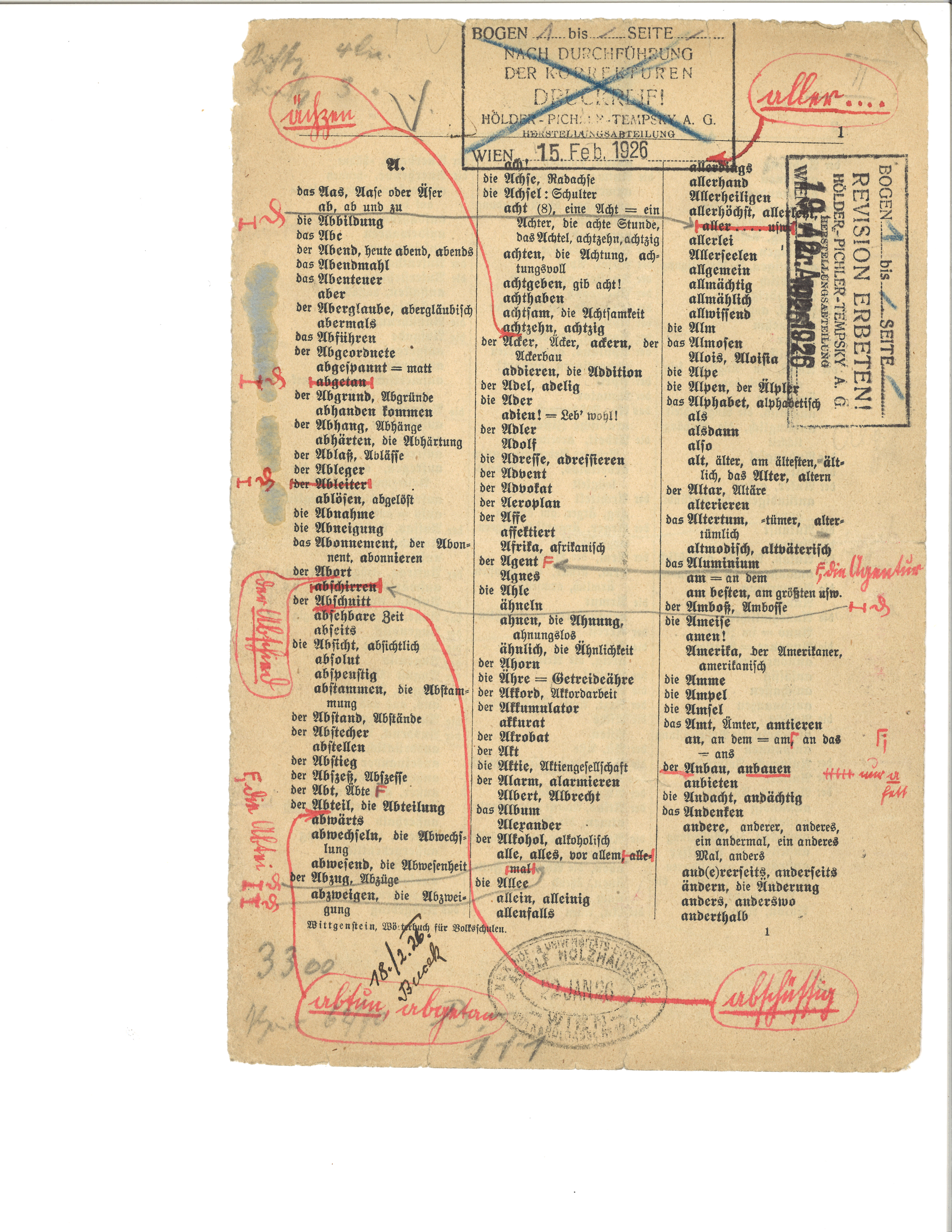 This set of proof pages is composed of 10 sheets interlaid booklet-style, with the word entries arranged in three columns. The editorial marks that fill the margins are rendered in 3 different colors and at times overlap one another. The first page of each section bears the stamp of Adolf Holzhausen, head editor of the Dictionary’s publisher (Hölder-Pichler-Tempsky), and a well-known Viennese patron of academic research.